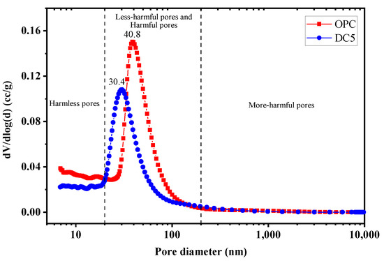 Based on the above experiments, when the content of diatomite is 5%, the concrete’s physical mechanics and RCP ability were optimal. Therefore, the MIP test analyzed the difference in pore characteristics between DC5 and OPC. Figure 13 exhibits the pore size distribution of DC5 and OPC. The pore size distribution ranges between 7 nm and 10,000 nm. Pores of different sizes are classified as harmless pores (<20 nm), less harmful pores (20–50 nm), harmful pores (50–200 nm), and more harmful pores (>200 nm) [40]. The most probable aperture is the pore size corresponding to the peak on the pore size differential distribution curve. The most probable apertures of DC5 and OPC are 30.4 and 40.8 nm, respectively, with DC5 being smaller than OPC. As can be seen, diatomite mainly changes the pores of concrete smaller than 200 nm and reduces the most probable apertures.