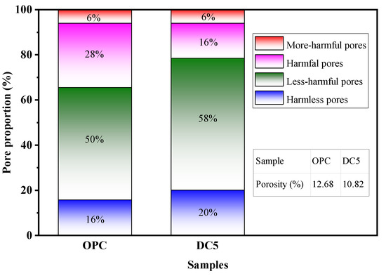 Figure 14 depicts the pore proportions of samples. The proportion of harmless and less harmful pores in DC5 is larger than in OPC, while the proportion of harmful pores in DC5 is smaller than in OPC. This indicates that 5% content of diatomite can change the proportion of pores with different pore sizes in concrete, reducing harmful pores, increasing harmless and less harmful pores. The previous section has shown that the performance of DC5 is better than that of OPC. This also confirms that pore characteristics are one of the factors affecting concrete performance. The porosity of DC5 and OPC is 10.82% and 12.68%, respectively. The porosity of DC5 is lower than OPC. In general, the 5% content diatomite decreases the total porosity of concrete by reducing the most probable aperture and increasing the proportion of micropores (<50 nm), thereby improving the performance of concrete.