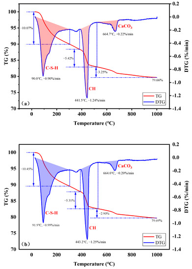 Figure 15 illustrates the TG and DTG curves of samples OPC and DC5. In the TG curves, the weight of the samples decreases as the decomposition temperature rises. Three endothermic peaks appear in the DTG curves. The chemical products can be identified based on endothermic peaks [41]. Three typical endothermic peaks are located between 30 and 290 °C, 400 and 470 °C, and 530 and 690 °C. These three temperature stages correspond to the dehydration and decomposition of calcium silicate hydrate (C-S-H), dehydration and decomposition of calcium hydroxide (CH), and decomposition of calcite (CaCO3), respectively [42,43,44,45]. Dehydration and decomposition of C-S-H result in a weight loss of 10.07% for OPC and 10.45% for DC5, with DC5 experiencing a greater weight loss than OPC. Similarly, the weight loss of OPC and DC5 due to calcite decomposition is 3.25% and 2.90%, respectively, with DC5 having a smaller weight less than OPC. However, dehydration and decomposition of CH cause OPC and DC5 to lose 5.42% and 5.31% of their weight, respectively, with OPC losing more weight than DC5.