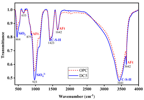 Figure 16 presents the FTIR spectra of the studied concrete samples OPC and DC5. Based on Wu et al. [46], the infrared absorption band can be used to identify the physical phase in the FTIR spectra. The characteristic wavenumber 464 cm−1 corresponds to the absorption band generated by SiO2. The absorption band of DC5 is stronger than that of OPC, suggesting more SiO2 in DC5 than in OPC. This is reasonable because DC5 contains 5% diatomite, but OPC contains none, and the main component of diatomite is SiO2. The strong absorption band at 923 cm−1 is caused by the vibration of SiO42− groups. This absorption is more prominent for DC5 than OPC, indicating that the former contains more SiO42− groups. The characteristic wavenumbers 875, 1642, and 3642 cm−1 are induced by the vibration of ettringite (AFt), which possess approximately the same absorption bands, indicating the presence of nearly equal amounts of ettringite in OPC and DC5. The vibration of C-S-H causes the absorption bonds at 1423 and 3441 cm−1 wavenumbers. The absorption band of DC5 is stronger than that of OPC, demonstrating that DC5 contains more C-S-H. Accordingly, the addition of diatomite to concrete produces more C-S-H, which can reduce concrete porosity and improve its properties.