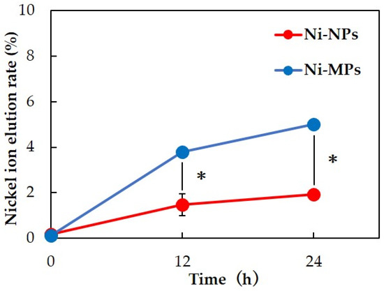 Inductively coupled plasma mass spectrometry was used to measure the nickel ion elution content over time for each particle dispersion. Results showed that more nickel ions were eluted from Ni-MPs than from Ni-NPs at 12 and 24 h after preparation of the dispersion. After 24 h, 5.00 ± 0.16% of Ni-MPs and 1.92 ± 0.04% of Ni-NPs were ionized from the total amount of dispersed particles (Figure 2).