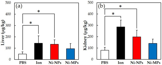 Comparison of nickel accumulation content in each organ after repeated oral administration test. (a) Liver, (b) kidney. Data are presented as the mean ± S.D., * denotes statistical significance p < 0.05.