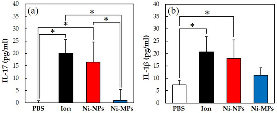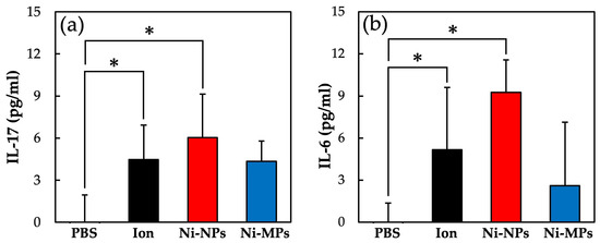 Figure 9 shows the concentrations of each cytokine in the serum as quantified using the ELISA. The serum IL-17 concentrations were significantly higher in the Ion (4.5 ± 2.5 pg) and Ni-NPs (6.0 ± 3.0 pg) groups than in the PBS group (below detection limit) (Figure 9a). Similarly, the serum IL-6 concentrations were significantly higher in the Ion (5.2 ± 4.3 pg) and Ni-NPs (9.3 ± 2.3 pg) groups than in the PBS group (below detection limit) (Figure 9b). No statistically significant differences were observed between the Ni-MPs and PBS groups based on any of the results.