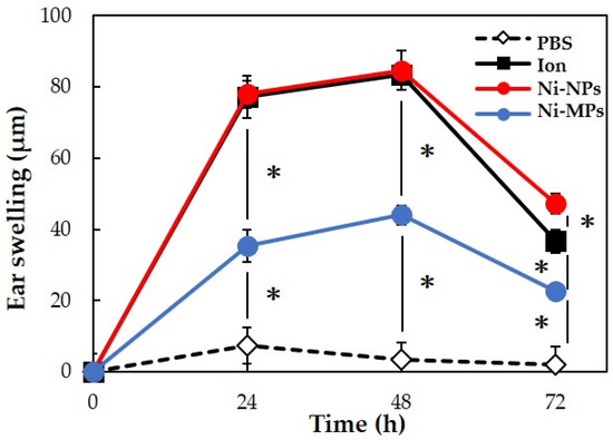 We used 20 BALB/c female mice to evaluate allergenicity, as in the 28-day repeated oral administration test. No mice died during the experimental period. Figure 7 shows the results of measurements of the auricle thickness in mice that underwent local elicitation of nickel allergy in the right auricle every 24 h and a comparison of swelling levels. Based on changes in auricle thickness in the PBS group, it was determined that the effects of LPS and fluid volume on the thickness were negligible. In the three groups (Ion, Ni-NPs, and Ni-MPs groups), which were sensitized to nickel, ear thickening increased after elicitation, peaked at 48 h, and then decreased. At 48 h after elicitation, the Ni-MPs group (44.0 ± 2.8 µm) showed a significantly higher value than the PBS group (3.3 ± 5.3 µm), and the Ion (83.3 ± 2.4 µm) and Ni-NPs (84.7 ± 2.4 µm) groups showed significantly higher values than the Ni-MPs group.