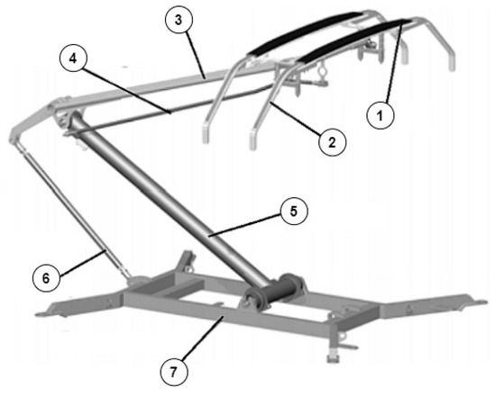 Scheme of single-arm pantograph where: 1—contact strip (sliding strip); 2—collector head; 3—upper arm and collector head guide; 4—upper guide rod; 5—lower arm; 6—lower guide rod; 7—base frame.