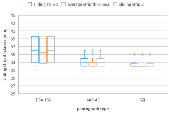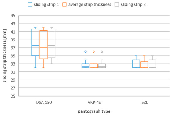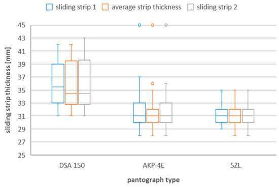 Since the values of the thickness of the sliding strips during their replacement with a new one differ between different types of current collectors, the list in the form of a box-and-whisker plot is presented in the following figures (Figure 2, Figure 3 and Figure 4).