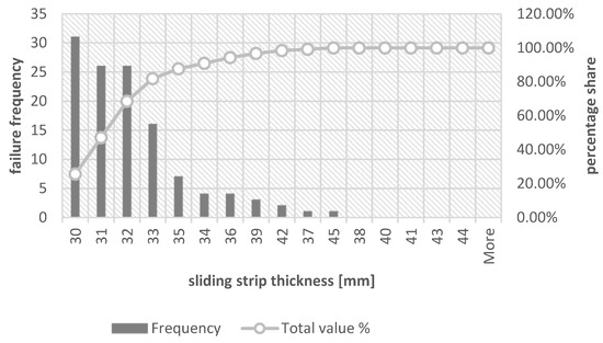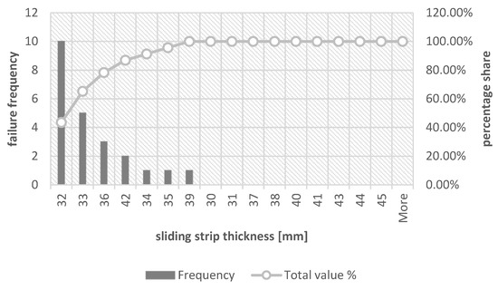 Sliding strip thickness histogram during replacement—cases included replacement caused by material defects (the average temperature in the month of measurement did not exceed 6.5 °C).