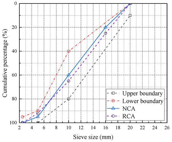 The cementitious materials used in this test were ordinary Portland cement (P·O 42.5) and grade I silica fume (SF). The main chemical composition and physical properties of cement and SF are shown in Table 1. Crushed stone was used as natural coarse aggregate (NCA), with a particle size of 5~20 mm. The recycled coarse aggregate was broken from the concrete with an original design strength grade of C40, and the particle size was 5~20 mm. Its grading curve is shown in Figure 1. Fine aggregate (S) was made from natural river sand with a particle size of 0.075~4.75 mm. The physical properties of the aggregate are shown in Table 2. The test water was tap water. A high-efficiency polyhydroxy acid water-reducing agent was used as the admixture; it had a water reducing rate of 23~25%. The diameter of BF monofilament was 15 μm. The physical indexes are shown in Table 3.