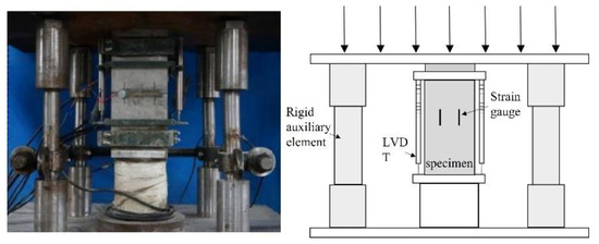 The cube compressive strength test was performed in accordance with the specification “Standard Test Method for Physical and Mechanical Properties of Concrete” (GB/T 50081-2019). In order to obtain a more ideal complete stress–strain curve under axial compression, a rigid auxiliary element was added to the press in this test. In the elastic stage, the force was used to control the loading. The loading speed was 0.8 KN/s; this was 80% of the axial compressive strength of concrete. In the convex ordinate of the ascending curve, displacement control was used; the loading speed was 0.002 mm/s. When the residual strength of the descending curve was 60% of the axial compressive strength, the displacement control loading rate was adjusted to 0.004 mm/s. When the load was 30% of the peak load, the test stopped. The test device is shown in Figure 3.