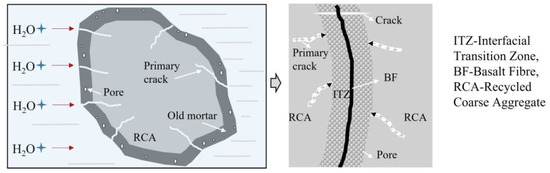 By analyzing the increase rate of the BF on the compressive strength of the NC and the RAC, it was found that the maximum increase rate of BF on the compressive strength of the RAC was greater than that of the NC. When the length–diameter ratio was 1200 and the volume fraction was 0.20%, the compressive strength of the RAC with the replacement rates of 50% and 100% increased by 18.31% and 24.0%, respectively, when compared with that of non-doped RAC. However, Liu’s results showed that the best compressive strength improvement was achieved when the fiber volume fraction was 0.2%. However, the increase rate was only 8% which may be caused by uneven fiber dispersion [18]. This is mainly because the “reservoir effect” of RCA and the “bridging effect” of BF have synergistic effects on RAC. The schematic diagram of the “reservoir effect” of RCA is shown in Figure 5. As depicted in this figure, in the BFRAC, the fiber and the base jointly bore the load, and the stress was conducted through the Interfacial Transition Zone (ITZ) between the fiber and the base. At the same time, due to the bridging effect of fiber, the propagation of primary cracks in concrete was constrained and limited. With the hydration of cementitious materials, the interfacial transition zone near the fiber surface had higher porosity and more defects were formed. Due to the presence of old mortar attached to the surface of the RCA and internal micro-cracks, the water absorption rate of the RCA was higher. In the mixing process, the RCA absorbed more free water inside the concrete and played the role of a “reservoir” inside the concrete. In the later curing period of concrete, the free water was gradually released to form an “inner curing” for the RAC, thus promoting the hydration of unhydrated cement particles and further improving the hydration degree. It also effectively reduced the porosity of the interface transition zone between RCA and BF, which improved the bond performance between BF and interface transition zone, as well as the strength of the RAC.