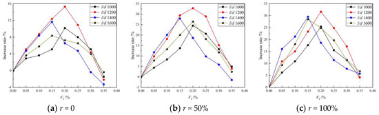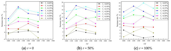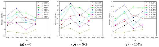 Figure 4 shows the relationship between the compressive strength of the BFRAC cube and the BF volume fraction. As depicted in Figure 4, when the RCA replacement rate was 0, 50% and 100%, the compressive strength of the BFRAC cube increased first and then decreased with the increase in BF volume fraction. This trend did not change with the length–diameter ratio. By comparing and analyzing the relationship between the compressive strength of BFRAC and the BF volume fraction at different replacement rates, it can be observed that the optimal volume fraction and the optimal length–diameter ratio of BFRAC are slightly different. The optimal volume fraction was 0.20~0.25%, and the optimal length–diameter ratio was 1200~1400. It is worth noting that the compressive strength of BF3516R0 was 3.06% lower than that of ordinary concrete, i.e., the fiber volume fraction was too large; this had an adverse effect on the compressive strength of NC. However, the RAC did not show a negative effect in the experimental dosage range.