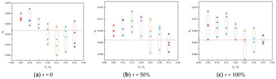 The tensile–compression ratio α1 can reflect the toughness and crack resistance of concrete materials. Figure 9 shows the scatter plot of the BFRAC’s tension and compression ratio under different replacement rates of recycled coarse aggregate. As depicted in Figure 9, the tension–compression ratio of the BFRC was smaller than that of the BFRAC, indicating that the effect of the BF on the RAC was better than that of the BF on concrete. This is because the recycled coarse aggregate has more pores and a rough surface which can increase the contact area with cement mortar and then increase the interface bond strength. In addition, in the process of RAC mixing, the mortar attached to the surface of the recycled coarse aggregate will quickly absorb water and combine with free water to form a film, and the absorbed water will be sealed inside. Thus, the “reservoir effect” is exerted [20].
