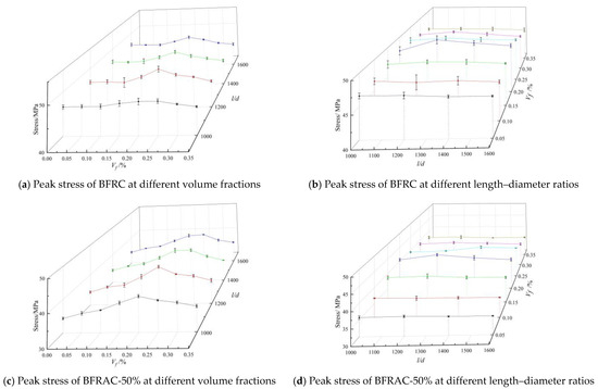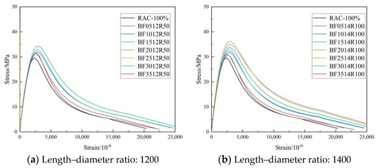 (2) The peak stress and peak strain of the RAC increased first and then decreased with the increase in the BF volume fraction. The effect of the BF length–diameter ratio on RAC peak stress and peak strain was small. The peak stress of the BFRAC with 50% and 100% replacement rates had maximum increase rates of 23.15% and 26.94%, respectively, and the peak strain of this concrete had maximum increase rates of 29.03% and 29.15%, respectively.