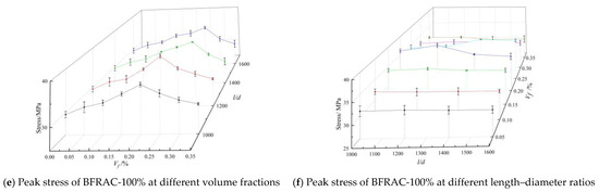 Figure 10 shows the curve of peak stress versus the volume fraction and the length–diameter ratio of BFRAC. As depicted in Figure 10a,c,e, the peak stress of BFRAC increased first and then decreased with the increase in the fiber volume fraction; there was an optimal volume fraction (0.20–0.25%) of peak stress of BFRAC with different length–diameter ratios. When the volume fraction was the optimal volume fraction, the peak stress of the BFRAC-50% and the BFRAC-100% increased by nearly 17.42~23.15% and 16.09~26.94% when compared with the RAC, respectively, and the peak stress of the BFRC increased by nearly 2.17~6.32% when compared with that of ordinary concrete under different fiber length–diameter ratios. The above results indicated that the effect of the BF on the peak stress of the RAC under uniaxial compression was significantly better than that of the NC. The main reason for this phenomenon is that the BF strengthens the interface transition zone between the surface adhesion mortar and the internal micro-cracks of the recycled coarse aggregate and the new cement mortar. In ordinary concrete, however, the BF only strengthens cement mortar.