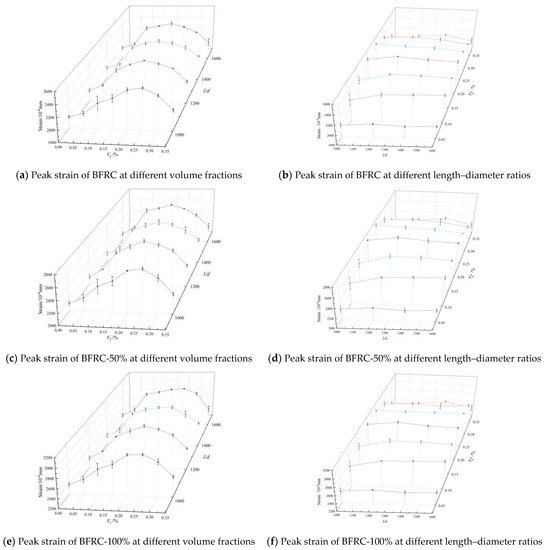 As depicted in Figure 11b,d,f, on the whole, the peak strain of BFRAC increased first and then decreased with the increase in the length–diameter ratio. The optimum length–diameter ratio was in the peak strain of concrete under different BF volume fractions. When the fiber volume fraction was the same, the BF length–diameter ratio had little influence on the peak strain of concrete. When the length–diameter ratio did not reach the optimal length–diameter ratio, the improvement rates of the BFRC, the BFRAC-50% and the BFRAC-100% were 0.94–6.23%, 0.73–6.24% and 1.72–6.19%, respectively. It is worth noting that the fiber length to diameter ratio on the increase rate of the peak strain of concrete is lower than the fiber volume fraction rate of the ascent of the peak strain of concrete; it shows that the number of fibers is the main factor influencing the peak strain of concrete. The fiber in the concrete in the form of a saturated three-dimensional grid structure is the essential reason for ascension of concrete ductility. However, when the fiber length–diameter ratio meets a certain anchorage length, the bond performance between the fiber and the concrete base is the premise to ensure that the fiber gives full play to its strengthening and toughening. By analyzing the microstructure of BFRC, Lin Jiafu [25] found that BF formed a dense three-dimensional spatial network structure inside the concrete, which greatly improved the mechanical stability of the micro-area of the concrete interface and inhibited the generation and development of micro-cracks in the concrete interface.