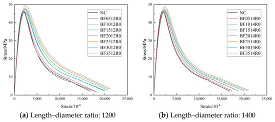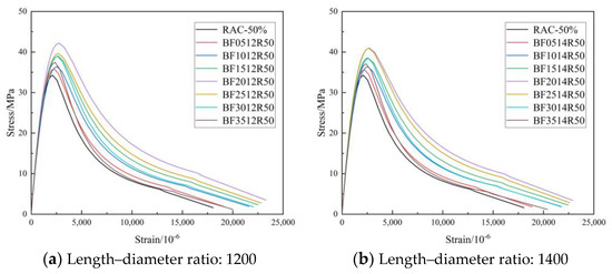 Figure 12, Figure 13 and Figure 14 show the complete stress–strain curves of the BFRC, the BFRAC-50% and the BFRAC-100% under uniaxial compression with the change in BF volume fraction under different fiber length–diameter ratios, respectively. As depicted in Figure 12, Figure 13 and Figure 14, the fiber length–diameter ratio, the fiber volume fraction and the recycled coarse aggregate replacement ratio had little influence on the shape of the stress–strain curve of concrete but had clear influence on the slope of the curve.