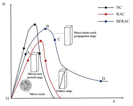 In the OA stage, the stress and strain of the BFRAC and the RAC increased linearly, whereas the stress–strain curve of BFRAC was basically on the left of RAC, thus indicating that the stiffness of BFRAC was greater than that of RAC. At the AB stage, the stress increased steadily while the strain increased at a higher rate, and the slope of the curve gradually decreased; the stiffness of the specimen degraded. With the increase in axial deformation, the stress–strain curve of the BFRAC was still on the left of the RAC. At this stage, the effect of the BF on RAC crack resistance began to appear. At the BC stage, after the RAC reached the peak load, the specimens failed rapidly and the load dropped sharply, and the RAC showed the characteristics of brittle failure. At this stage, the rate of decline of the BFRAC curve was relatively slow, and the stress–strain curve was located on the upper side of the RAC. The main reason is that, at this stage, fiber and concrete worked together in coordination. The BF played a role in the form of bridge stress, across the crack interface transfer stress, thus effectively avoiding the phenomenon of “one crack, two stages”. In the CD stage, the stress–strain curve of the BFRAC decreased gradually and became flat. At this stage, the BF was pulled out and broken into large quantities, and the specimen was seriously damaged. Meanwhile, RAC and NC showed no flat segment, which showed a split and two segments in macro.