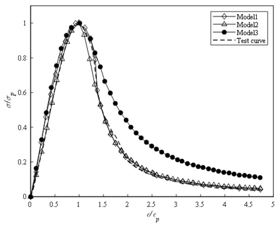At present, the stress–strain curve equation of concrete is generally expressed in a dimensionless way, that is, ( is the strain corresponding to the peak stress, and is the peak stress of the curve). The existing concrete stress–strain curves all need to meet the following four boundary conditions: