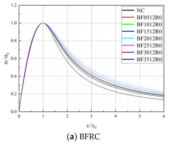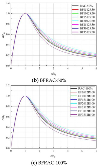 According to the analysis in Section 3.1, the BF length–diameter ratio has little influence on the relevant mechanical properties of concrete, such that the optimal length–diameter ratio of 1200 is taken as an example. The Nonlinear Cur Fit function in Origin software was used to fit the stress–strain test data of BFRC, BFRAC-50% and BFRAC-100% axial compression. The fitting results are shown in Figure 18. As depicted in Figure 18, the BF had a small impact on the ascending section of the RAC, but a large impact on the descending section.