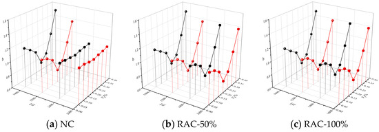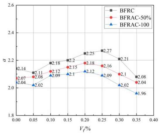 Parameter a represents the ratio of the initial elastic modulus of concrete axial compression to the peak secant modulus [27]. Figure 19 shows the curve of a value of the BFRAC. As depicted in Figure 19, the a value increased first and then decreased with the increase in the fiber volume fraction, and the overall change range was small. The a values of the BFRC, the BFRAC-50% and the BFRAC-100% were 2.08–2.27, 2.04–2.18 and 1.96–2.12, respectively. Therefore, the average a values of the BFRC, the BFRAC-50% and the BFRAC-100% were 2.19, 2.12 and 2.06. Figure 20 shows the b value change curve of the BFRAC. As depicted in Figure 20, the b value decreased first and then increased with the increase in the fiber volume fraction. The distribution range of the b value was 0.78~1.53, and the variation range was larger than that of the a value on the whole, thus proving that the effect of the BF on the descending section of the RAC was greater than that on the ascending section.