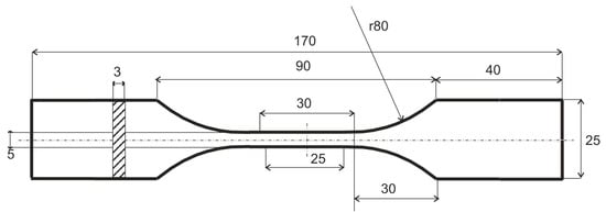 Biodegradable epoxy resins should indicate physical and chemical properties, as well as mechanical properties, that are similar to unmodified resins with practically unlimited disintegration time. Therefore, experimental uniaxial stretching tests according to ASTM638 were conducted on test specimens made of epoxy resins with an organic additive. A series of reference test specimens made of unmodified epoxy were also examined. The nominal dimension of the test specimen is shown in Figure 3.
