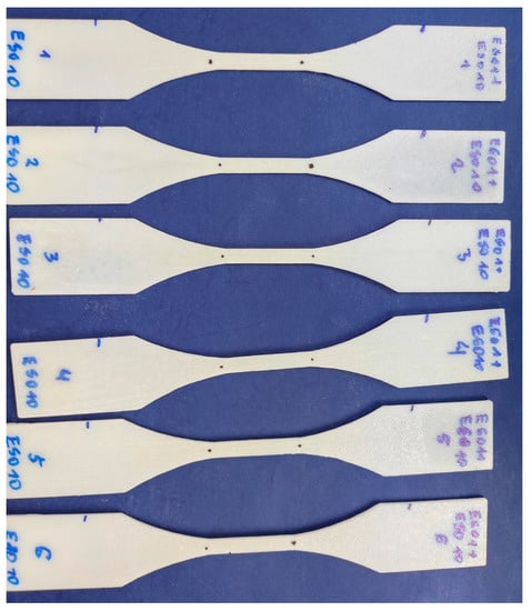 An example of a damaged specimen is shown in Figure 11a. A set of damaged specimens in the uniaxial tensile test specimens made of E601 epoxy resin with the addition of ESO3 is shown in Figure 11b. On the other hand, Figure 11c shows a set of damaged specimens made of E601 with the addition of MC10.