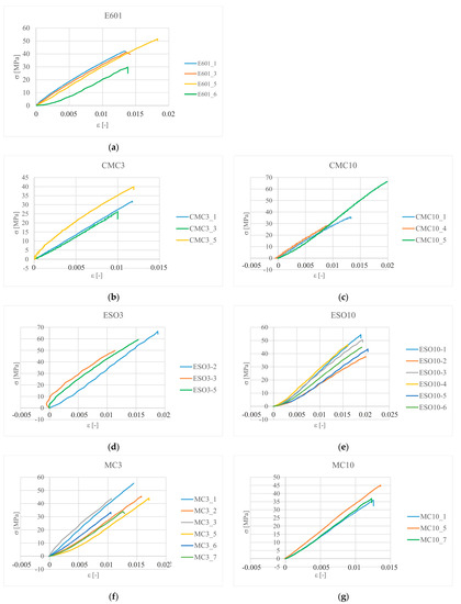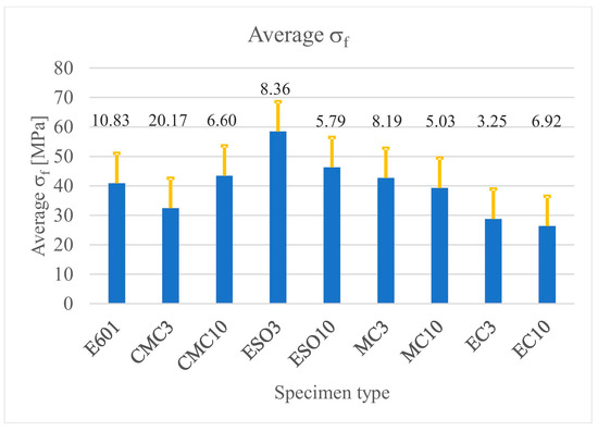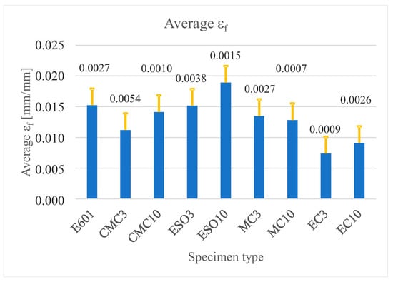 The obtained values of failure stresses (σf) (σf) were averaged for each test and presented in the form of diagrams (Figure 9) with standard deviation bars. The same method was used to visualize the longitudinal failure strains (εf) (εf) and their standard deviation, which are presented in Figure 10.