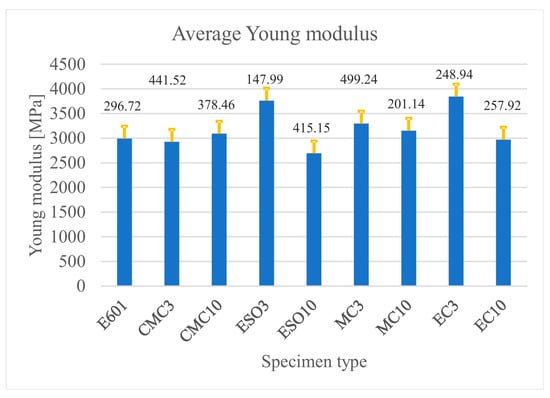 Average values of Young’s modulus with standard deviation bars as a function of the specimen type.