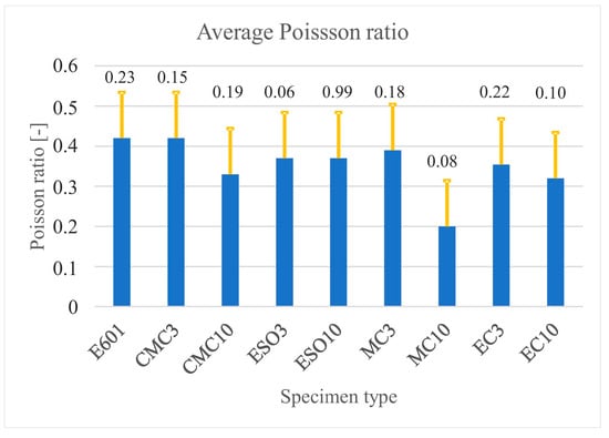 Figure 8 places the average values of Poisson’s ratio as well as standard deviation bars as a function of the specimen type. Poisson’s ratio was determined as the angle of the slope of the transverse strain curve as a function of the longitudinal strain. Calculations were performed for each specimen tested using Excel. The value given in Table 3 is the average obtained after rejecting extreme values.