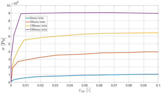 In Figure 3, one can observe a typical stress–strain relationship for various elongation rates. Herein, the results of the standard experiment are presented.
