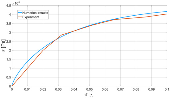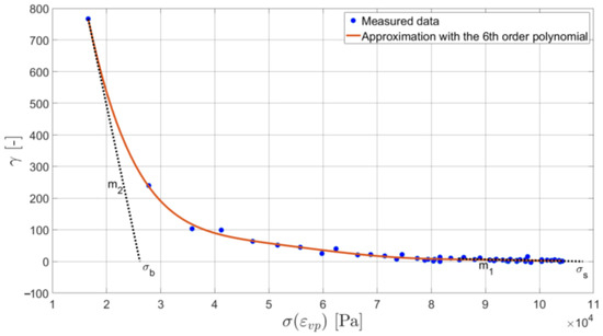 The sensitivity analysis of the model revealed that the final results are particularly sensitive to the value of parameter . Thus, special attention needs to be paid to its identification. The improvement can be obtained in a twofold manner. First of all, a number of experiments with various elongation rates can be substantially increased. Secondly, algorithms other than Marquardt–Levensberg [28] can be applied to increase the reliability of the function (see Figure 5) approximation.
