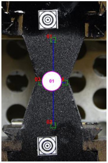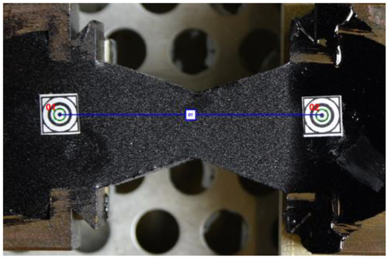 The specimen shape is shown in Figure 2. Slightly different shapes are also used in ductilometer tests. All of them allow for the approximated uniaxial tensile tests. In fact, the elongation measurements refer to the points in the central axis of the specimen. In terms of the DIC technique, it is equivalent to a single pair of markers used as shown in Figure 7.
