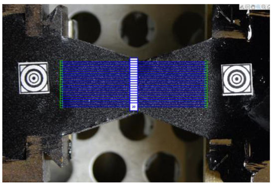 The DIC technique was also used for the Poisson ratio assessment, which could not be carried out using only the ductilometer test results. Namely, a pair of perpendicular virtual tensometers was placed on the specimen, as shown in Figure 10.