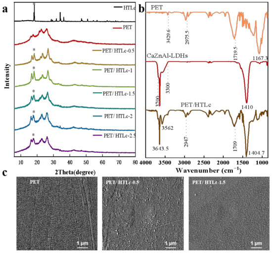 Morphology and structure of PET/HTLc films: (a) XRD patterns of a series of PET/HTLc composite films, asterisks denote the 001 reflections. (b) FT-IR spectra of PET, CaZnAl-LDHs and PET/HTLc film. (c) SEM images of PET, PET/HTLc-0.5 and PET/HTLc-1.5.