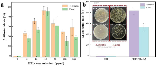Antibacterial performance of HTLc and PET/HTLc-1.5: (a) Antibacterial rates of HTLc against S. aureus and E. coli at different concentrations. (b) Antibacterial rates of PET/HTLc-1.5 film against S. aureus and E. coli.