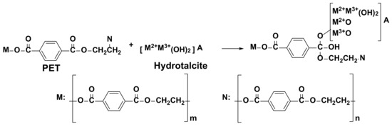 The use of functional additives might improve the crystallinity, thermal stability, antibacterial activity and barrier property of PET at the same time. Among the inorganic fillers that can modify the polymers’ properties and functionalities, layered double hydroxides (LDH) are very attractive and versatile [13]. Divalent and trivalent metal hydroxides are covalently bonded to each other to form the main lamellae and are rich in positive charge, while interlayer anions are arranged in an orderly manner to balance the charge of the main lamellae with electrostatic force, and the two are alternately stacked to form two-dimensional layered materials [14,15].