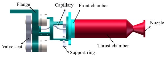 The ADN-based thruster consists mainly of a valve seat, flange, support ring, capillary tube, front chamber, thrust chamber, and nozzle, the geometric model of which is shown schematically in Figure 1. During operation of the thruster, the liquid propellant in the upstream capillary tube is affected by the exothermic catalytic combustion in the downstream thrust chamber, resulting in a gas–liquid two-phase flow phenomenon with local boiling.
