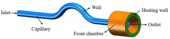 Figure 2 shows a schematic diagram of the geometric model with boundary conditions. To reduce the number of computations, in this study, the capillary tube and part of the front chamber structure are used as the computational domain, with the pressure inlet on the left side of the capillary tube and the pressure outlet on the right side, and the heating wall is set as a constant wall temperature boundary.