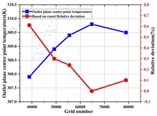 Before running the simulation, the grid independence is first verified, and the effect of the grid number on the simulation accuracy is shown in Figure 4; the temperature at the center point of the capillary tube outlet plane at different grid numbers is used as the calculation criterion. The results show that the temperature at the center of the capillary tube outlet plane is gradually stabilized with the gradual increase in the grid number. Among them, the calculation results under the grid number of 64,801 are used as the benchmark, and the relative deviations for the grid number of 55,512 and 78,939 are 0.24% and 0.10% respectively, which are both within the relative deviation of 0.30%. This shows that the case with the grid number of 55,512 could meet the calculation requirement.