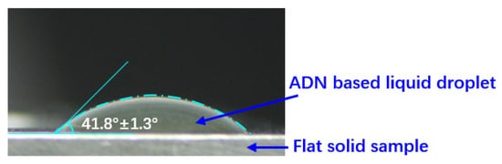The static contact angle for wall adhesion calculation in ANSYS Fluent was determined using the sessile drop, the most commonly used contact angle measurement method [26]. The ADN-based liquid drop was placed on the flat sample that is made of the same material as the capillary tube. The image of the drop was captured by a high-resolution camera (see Figure 5). After six repetitive shots and tests, the contact angle was determined to be 41.8° ± 1.3° under current conditions.