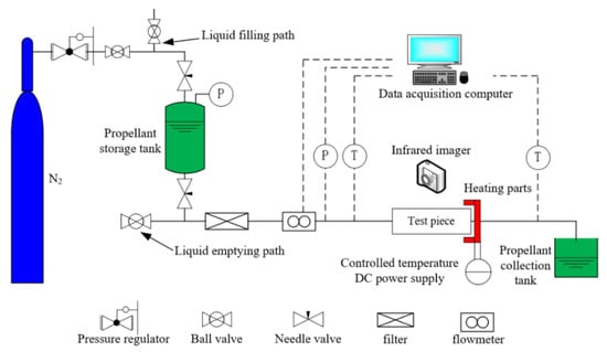 In order to verify the accuracy of the established numerical model, numerical simulations of the flow boiling of ADN-based liquid propellant in the capillary tube were performed at a heat reflux temperature of 800 K, and the capillary inlet and outlet pressure drop of 0.5 MPa. The simulated inlet mass flow rate and the temperature at the outer wall surface of the capillary tube (at about 4.3 mm from the capillary tube outlet) were compared with the experimental results. The same capillary structure and boundary conditions were used for the simulation and the experiment. The experimental system (Figure 6) consists of three parts: a storage tank, test section bench, and data acquisition system. The storage tank contains ADN-based liquid propellant, and a constant pressure nitrogen cylinder is used to control the inlet pressure value. The detailed experimental system and descriptions are given in [4].