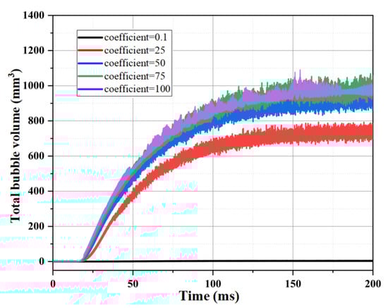 Figure 7 compares and analyzes the variation of the total volume bubbles in the capillary tube at different mass transfer coefficients (0.1, 25, 50, 75, 100). As can be seen from the figure, the value of the mass transfer coefficient affects the degree of vaporization of the ADN-based liquid propellant flow boiling in the capillary tube under the same simulated conditions, and the total volume of bubbles generated in the capillary tube increases with the increase in the mass transfer coefficient. When the mass transfer coefficient was 0.1, the total bubble volume was about 4.0 mm3; whereas, when the mass transfer coefficient was 100, the total bubble volume generated reached about 953 mm3.