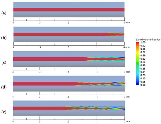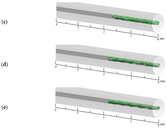 Gas–liquid iso-surface in capillary tube at 200 ms at different heat reflux temperatures: (a) 400 K, (b) 500 K, (c) 600 K, (d) 700 K, and (e) 800 K.