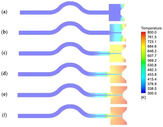 Temperature distribution in the axial section of the capillary tube at different times: (a) 0 ms, (b) 10 ms, (c) 50 ms, (d) 100 ms, (e) 150 ms, and (f) 200 ms.