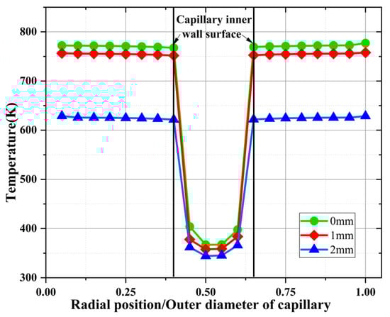 Figure 10 shows the radial temperature distribution of the capillary tube at 0 mm, 1 mm, and 2 mm from the capillary exit at a temperature of 800 K for 200 ms. The horizontal coordinate is the ratio of the radial position of the capillary to the outer diameter of the capillary. As can be seen from the figure, the capillary tube in the same section, the temperature shows an axisymmetric distribution pattern; the temperature of the solid part of the capillary tube is basically the same at 200 ms. Under the cooling effect of the ADN-based liquid propellant, the temperature of the inner wall surface of the capillary tube was found to decrease rapidly, and the closer to the center region of the capillary tube, the lower the temperature. From this figure, it can be seen that when the heat reflux temperature is transferred to the inner wall surface of the capillary tube, the ADN-based liquid propellant first generates bubbles on the inner wall surface under the effect of fluid–solid coupling heat transfer, so that the phase change in the ADN-based liquid propellant can be suppressed by reducing the heat transfer to the inner wall surface.