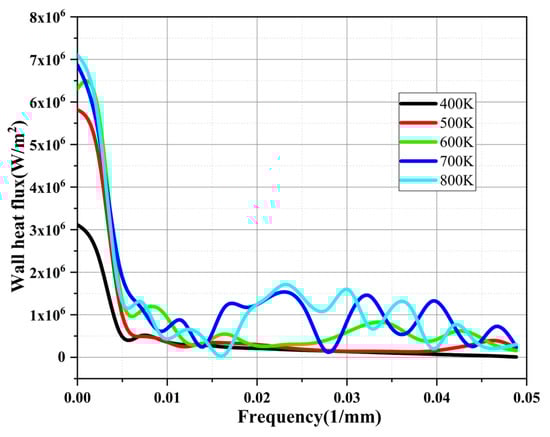 Figure 12 shows the FFT (Fast Fourier Transform) analysis results of the wall heat flux for different heat reflux temperatures, with increase in frequency; that is, the closer to the capillary tube outlet, the more the amplitude of the wall heat flux gradually increases. When the heat reflux temperature is 800 K, the maximum amplitude is 7 × 106 W/m2. When the heat reflux temperature is 400 K, the maximum amplitude of the wall heat flux is 3 × 106 W/m2. The amplitude is reduced by about 57%. As the heat reflux temperature gradually increases, more bubbles are generated by the phase transition of ADN-based liquid propellants in the capillary tube. As a result, the amplitude of the wall heat flux in the capillary tube gradually increases as the bubbles form and coalesce. Additionally, with the gradual increase in frequency, the amplitude of the wall heat flux density shows a tendency to gradually decrease.
