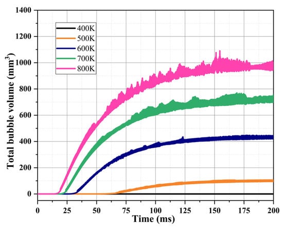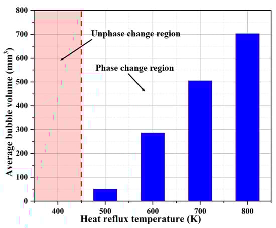 Figure 15 shows the comparison of the average bubble volumes inside the capillary tube and the time of bubble generation. From the figure, it can be seen that with the gradual increase in the heat reflux temperature (400 K~800 K), the average bubble volumes generated in the capillary tube gradually increase (0 mm3, 50 mm3, 286 mm3, 505 mm3, 702 mm3), and the increase in the heat reflux temperature intensifies the phase change in the ADN-based liquid propellant in the capillary tube, so that more bubbles are generated in the unit time.