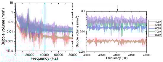Figure 14 shows the FFT analysis of the bubble volume in the capillary tube versus time. As can be seen from the figure, the fluctuation frequencies of the bubble volume under different heat reflux temperatures are all around 17 kHz. The fluctuation range of the bubble volume in the capillary tube increased as the heat reflux temperature increased. When the heat reflux temperature is 400 K, the phase transition temperature of the ADN based liquid propellant is not reached. Therefore, at 400 K, the single-phase flow in the capillary tube is mainly liquid phase, and the bubble volume does not fluctuate significantly. As the heat reflux temperature increases, the ADN liquid propellant in the capillary tube changes phase, and the bubble volume fluctuates significantly with the formation and coalescence of bubbles. When the fluctuation frequency is 17 kHz, the fluctuation range of the bubble volume increases from 0.04 mm3 at 500 K to 1.83 mm3 at 800 K.