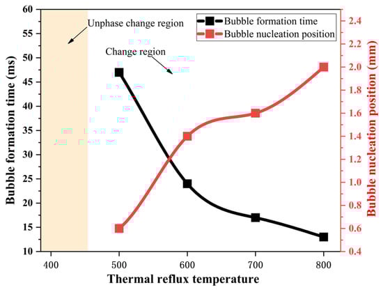 Figure 16 shows the comparison of the bubble generation times and bubble formation positions at different heat reflux temperatures. From the figure, it can be seen that bubbles are generated earlier in the capillary tube at higher heat reflux temperatures, and the first bubble is generated at 47 ms for the ADN-based liquid propellant at 500 K, while the time of the first bubble generation is advanced to 13ms when the temperature reaches 800 K.