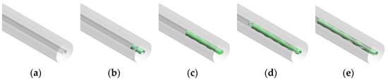 Gas–liquid iso-surface in a capillary tube at different mass transfer coefficients: (a) 0.1 s−1, (b) 25 s−1, (c) 50 s−1, (d) 75 s−1, and (e) 100 s−1.